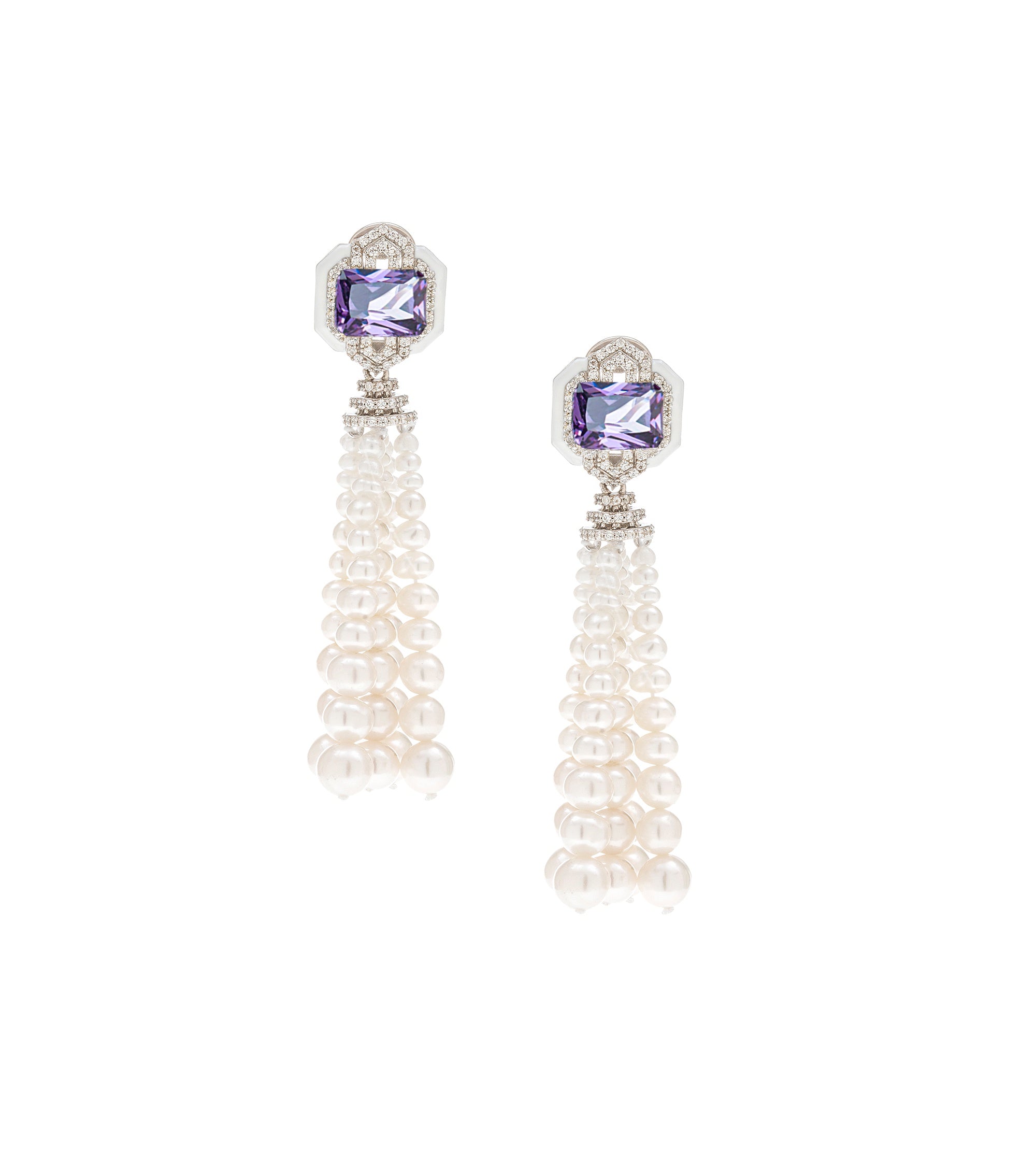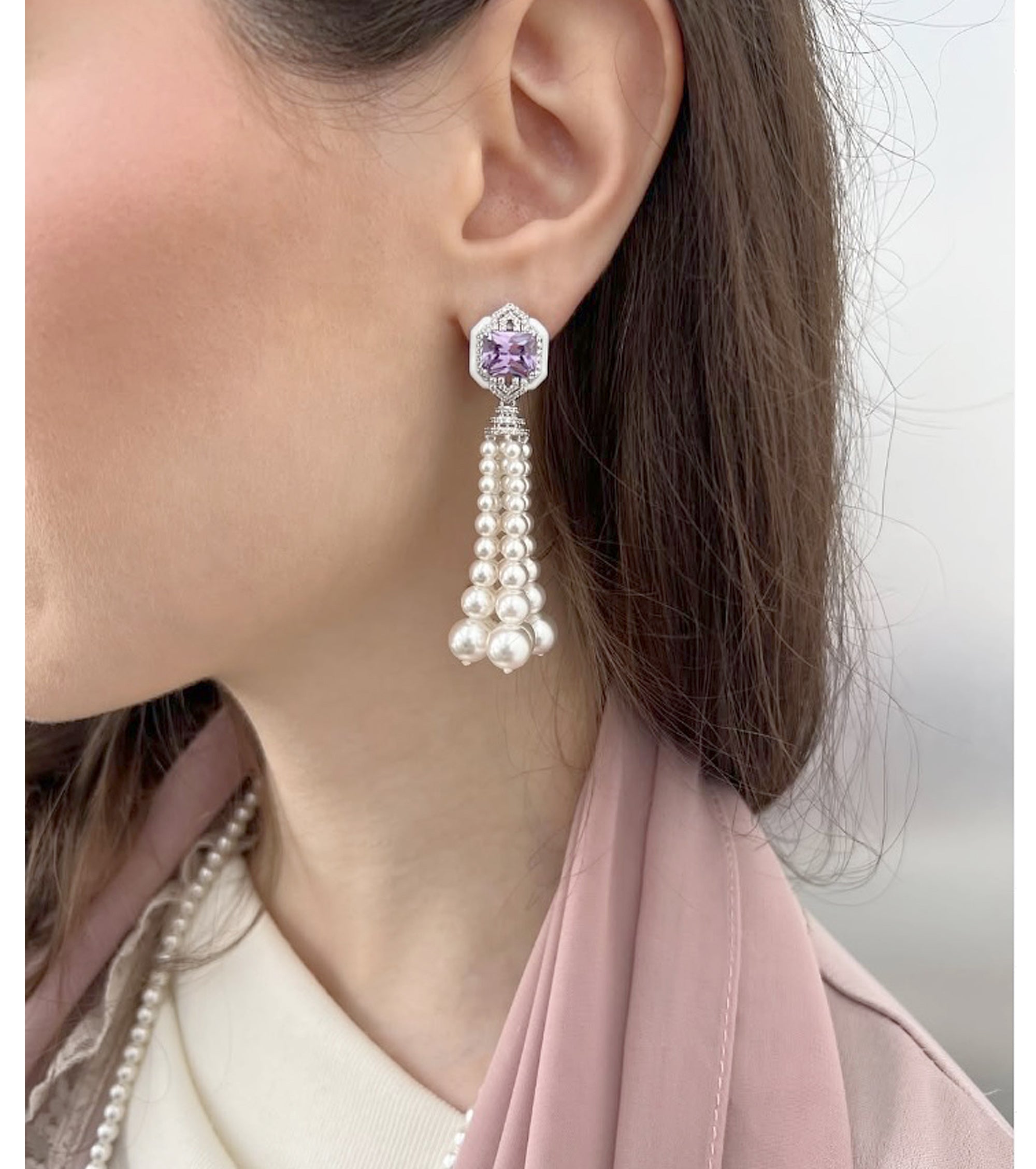 قرط أذن من لؤلؤة صدفية نحاسية مع شرابة مستطيلة من الزركونيوم الأرجواني