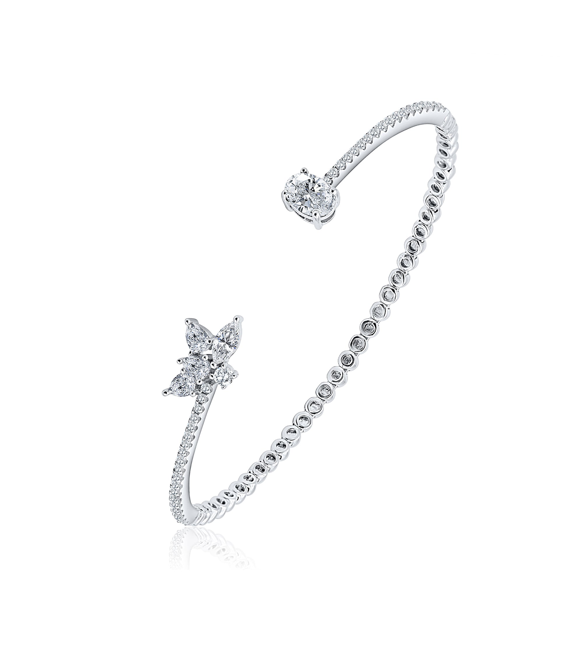 هذا السوار مرصّع بمجموعة رائعة من أحجار الماركيز على أحد جانبيه، تشبه نبتة الصبار. وعلى الجانب الآخر، حجر ألماس رائع مقطوع بشكل فردي. مثالي للتكديس!