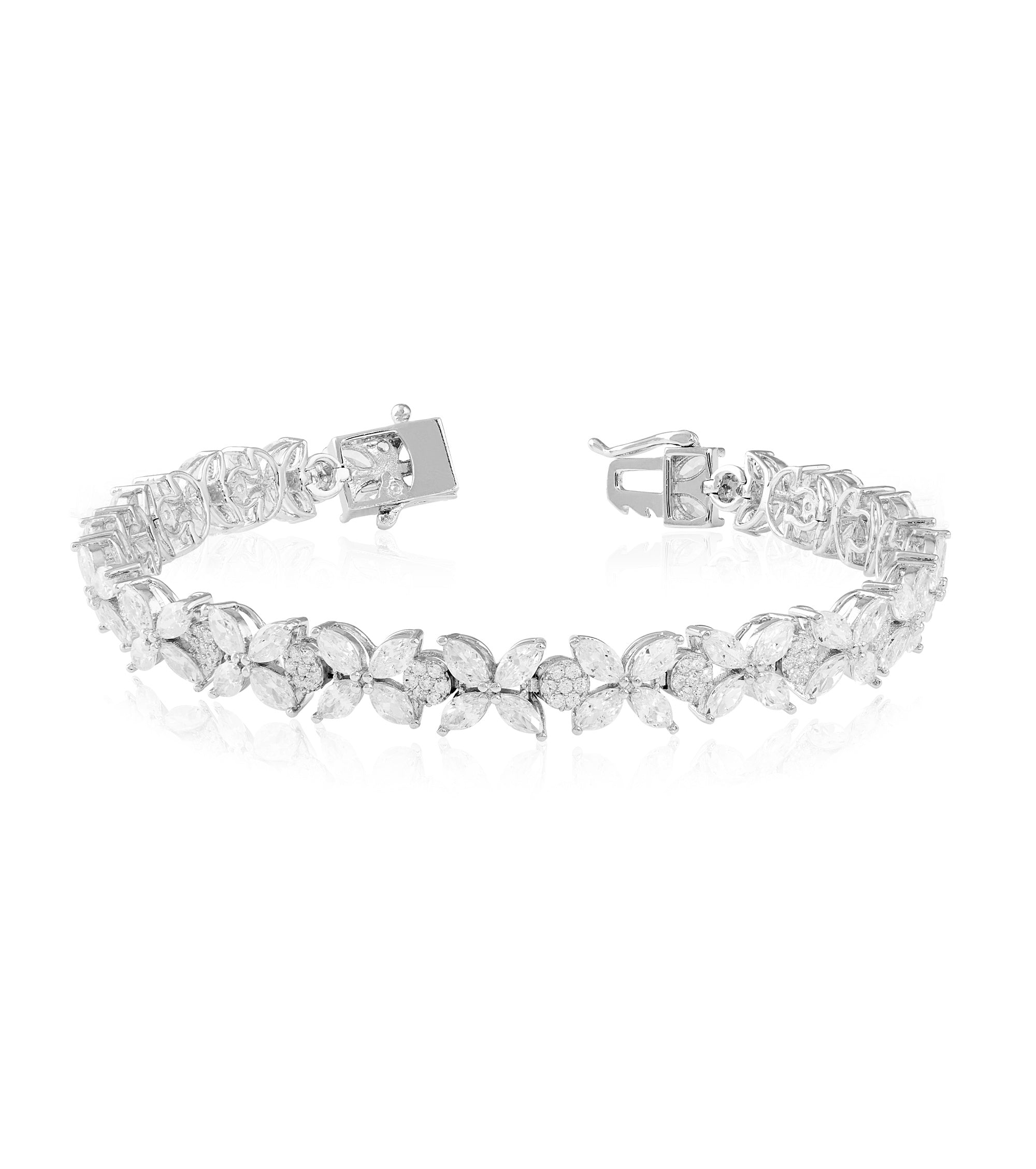 Marquise and round cut zirconia encrusted skillfully on 925k silver, this bracelet rests elegantly on the wrist. Accompanied by matching earrings, necklace and ring, create the most dazzling, sophisticated ensemble for your special evening.