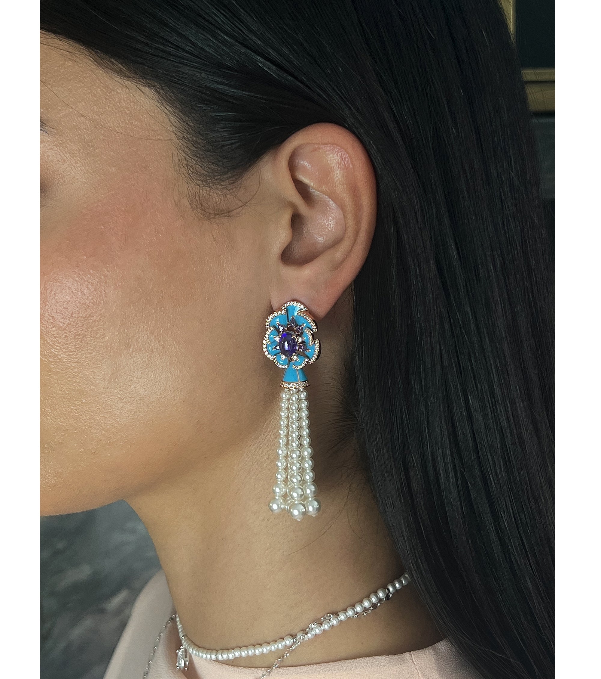 Purple CZ Blue Petal Tassel Earrings