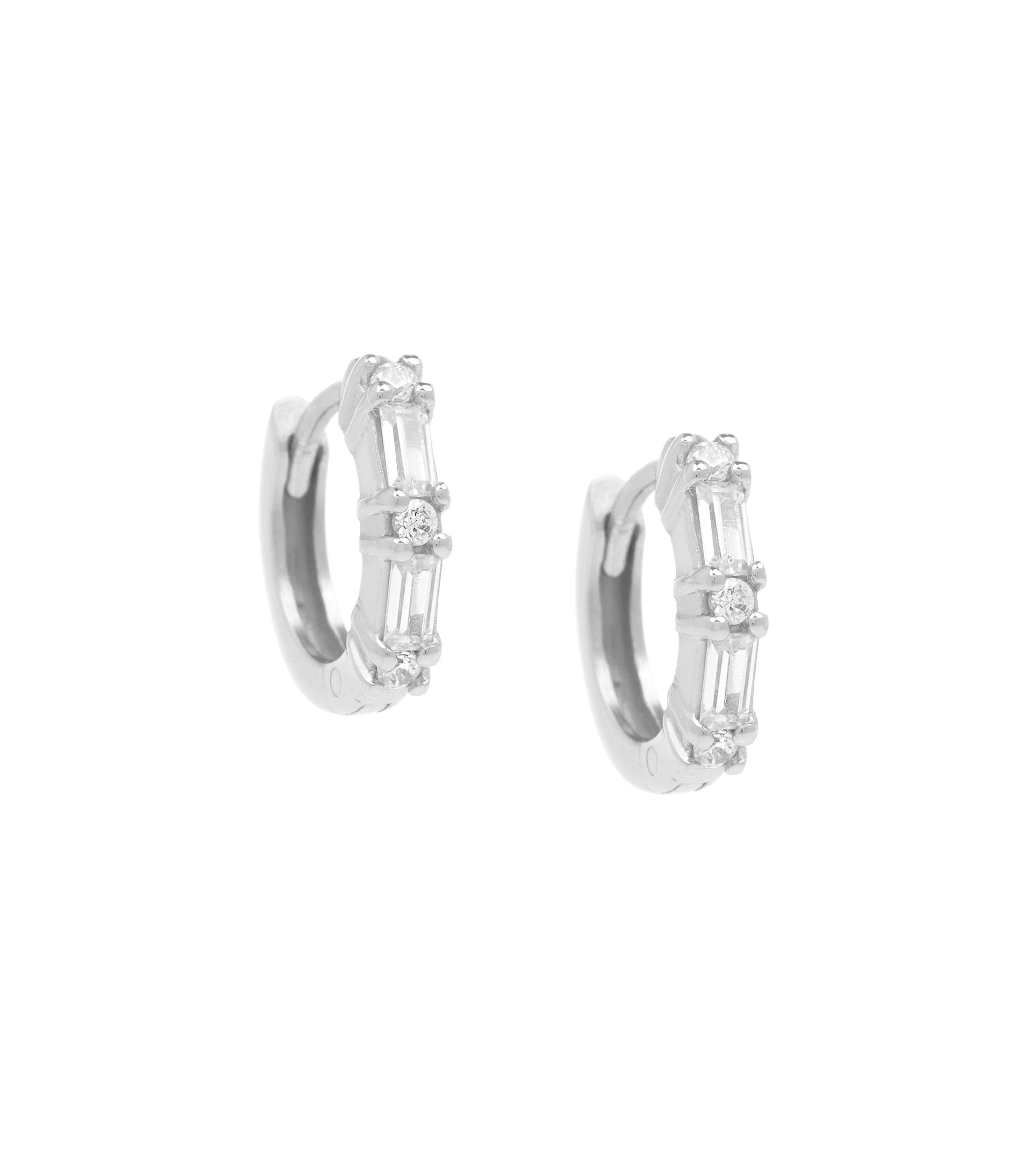 These 925 silver mini hoops encrusted with baguette-cut zirconia call out modern elegance. Perfect for stacking. Coordinate with other mini hoops or studs and top off with an ear cuff to bring your ear game to a whole new level.