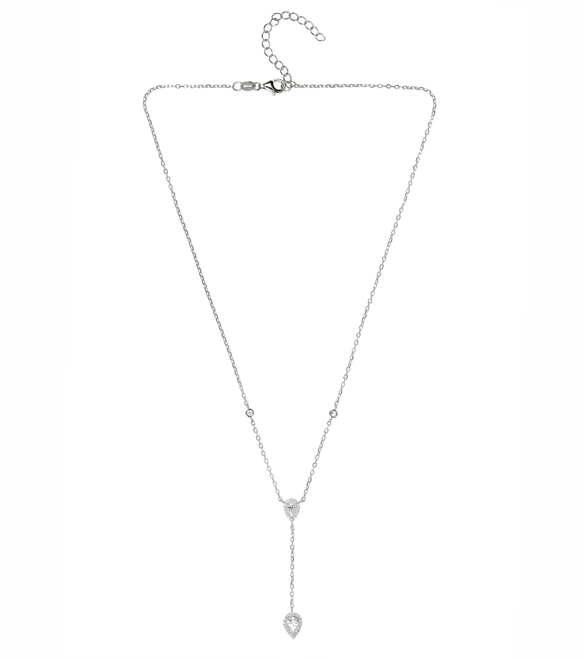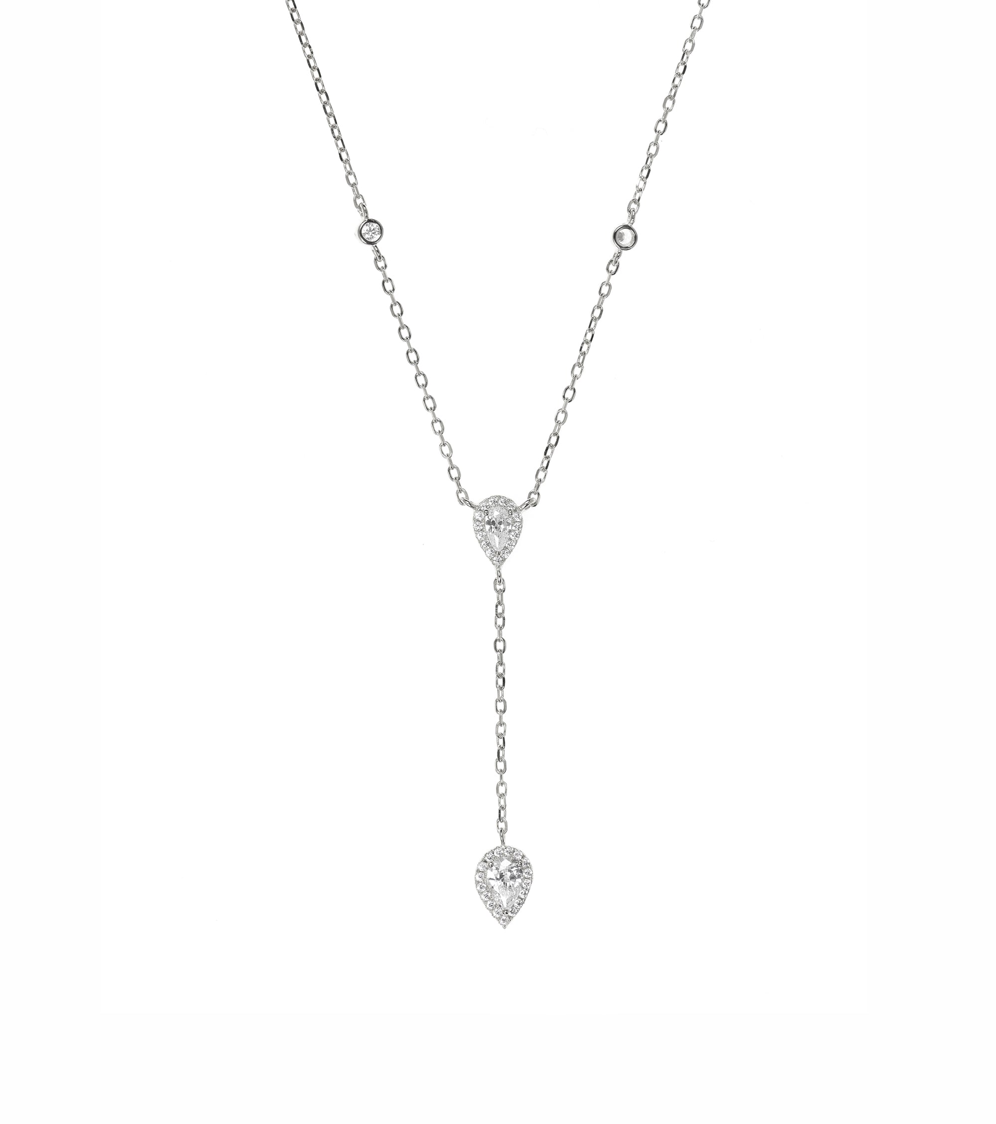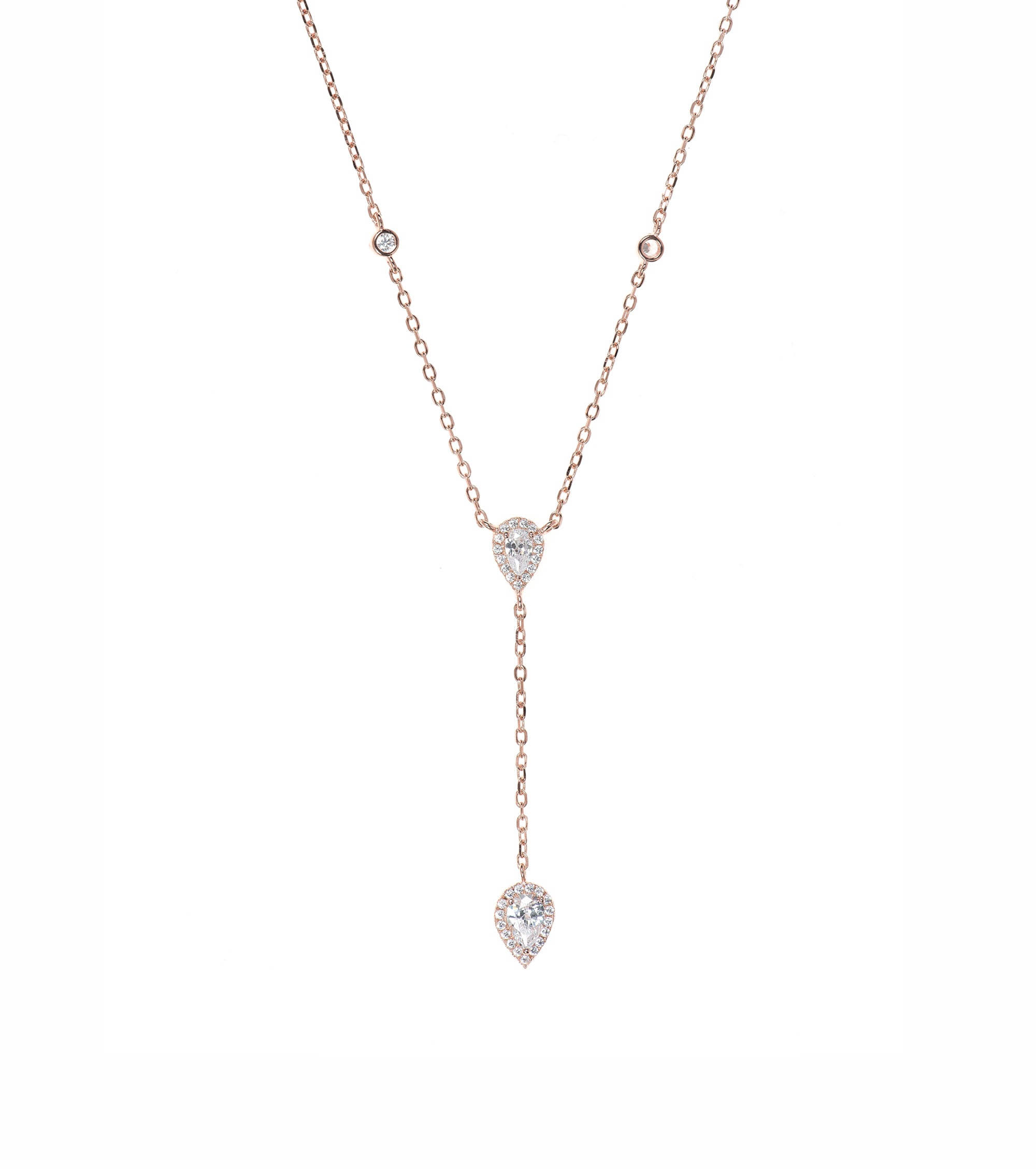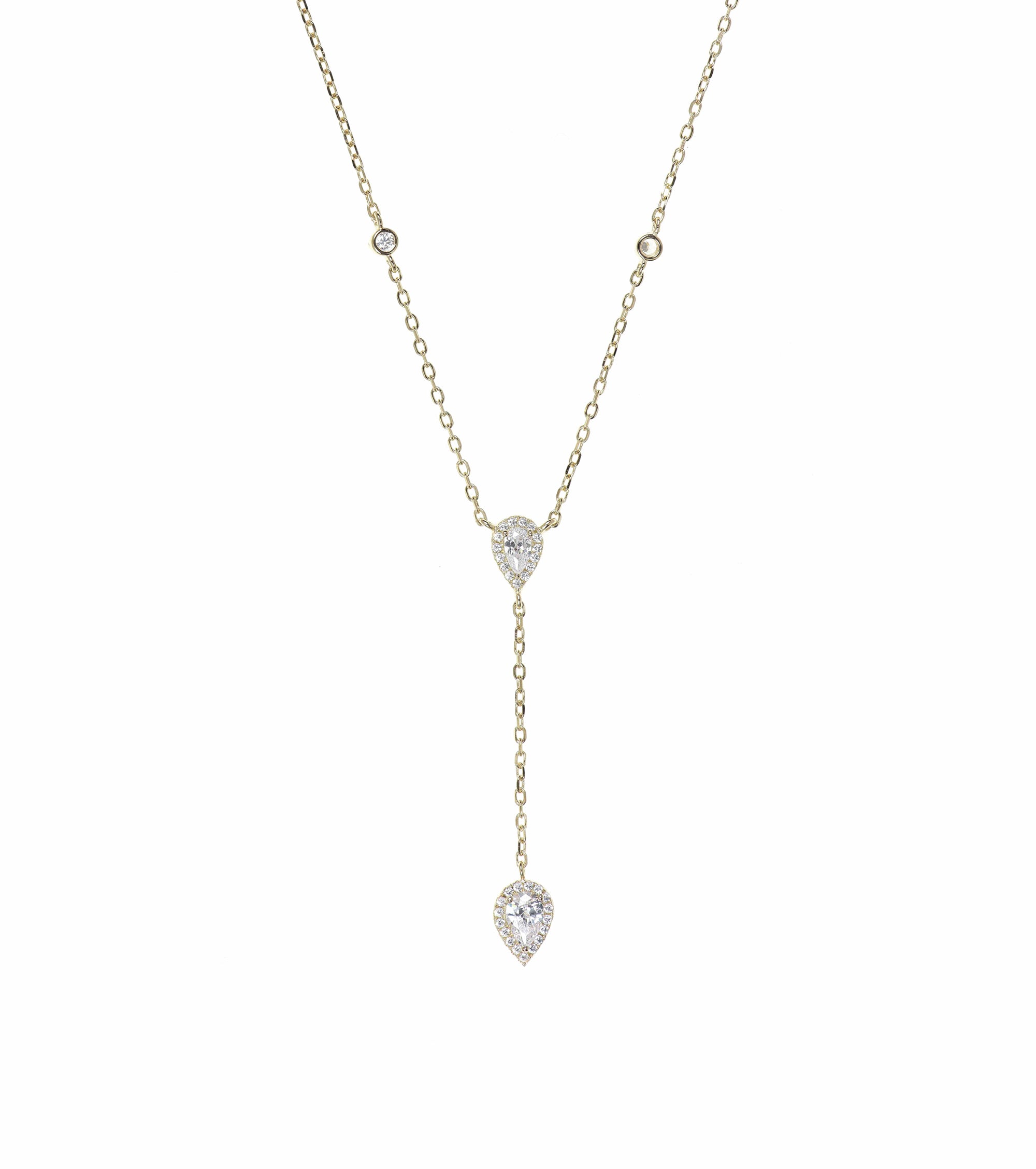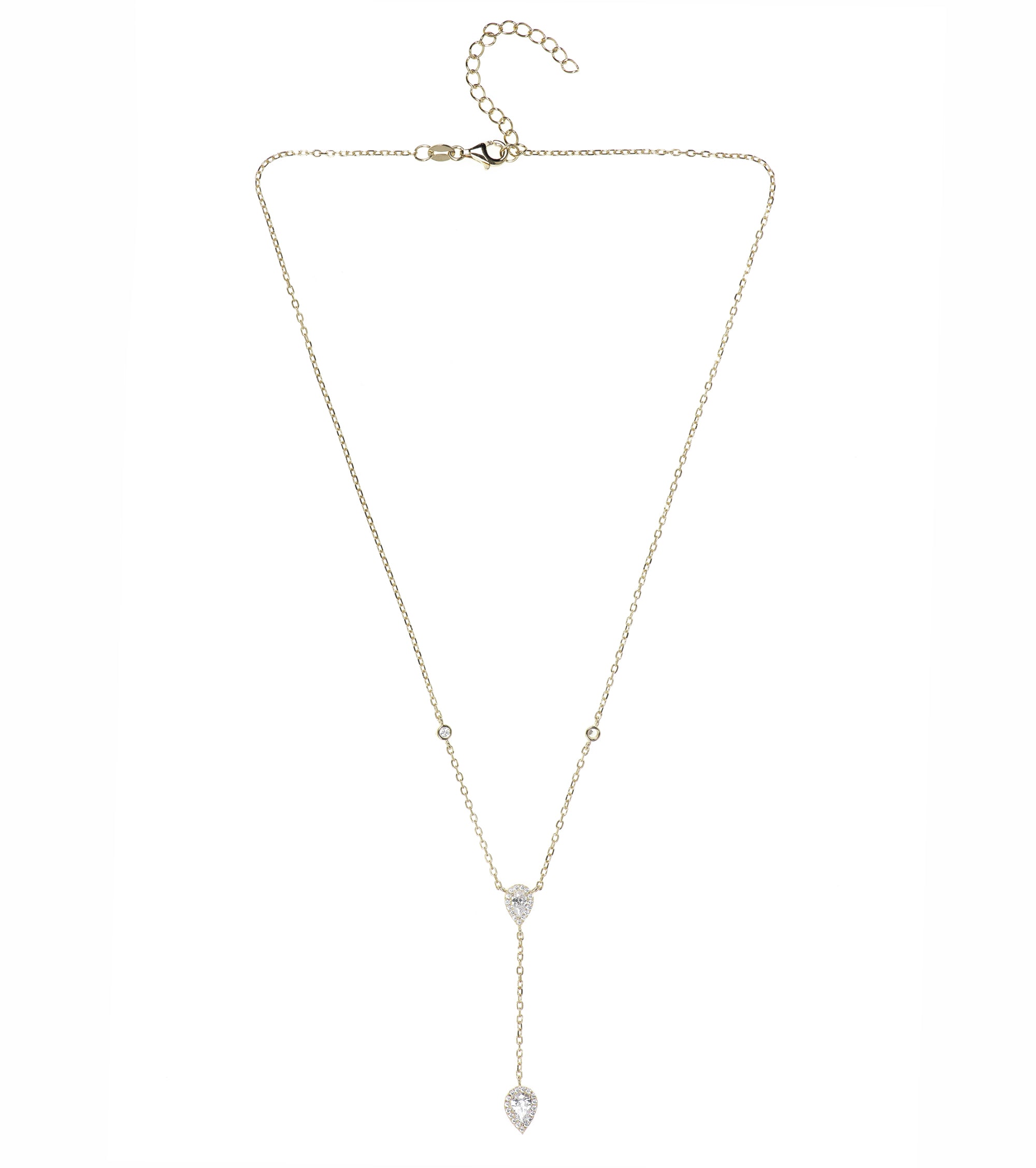 This season is all about layering and lariat necklaces are just the piece for that. Featuring two brilliant framed drops connected by a dainty chain, this piece exudes elegance. On trend and modern, it still has the timeless quality which will endure seasons to come.