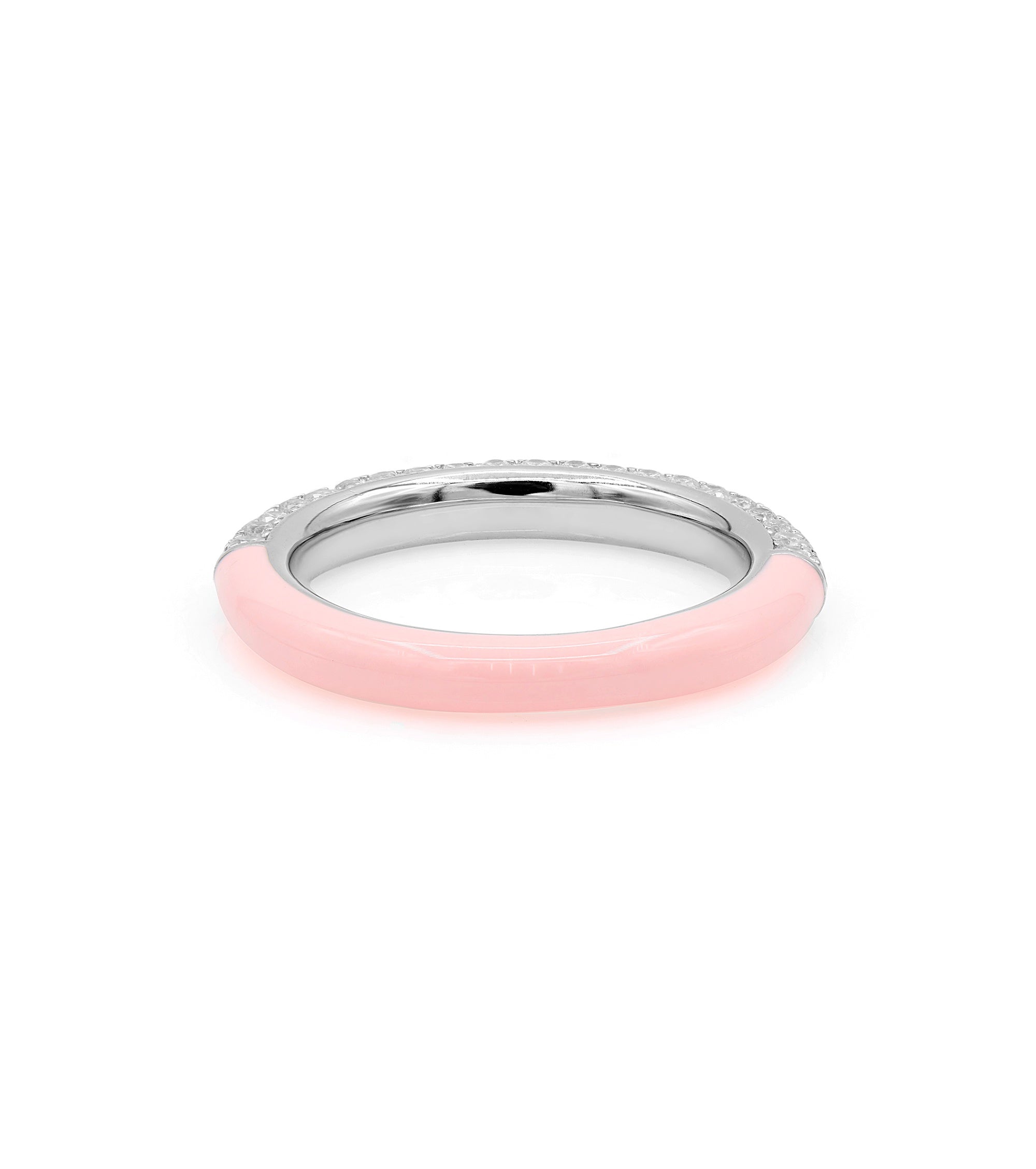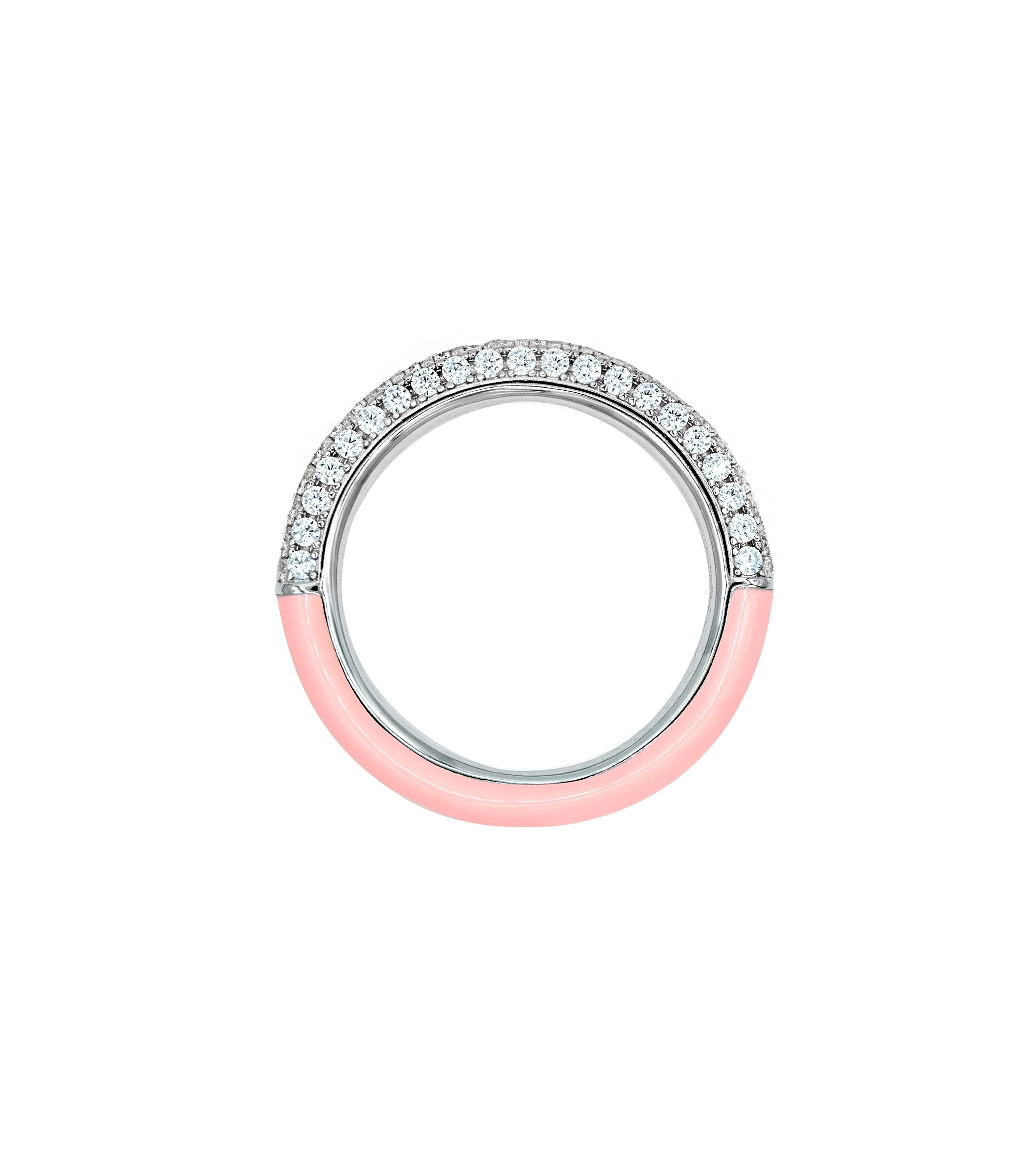 This piece has a youthful yet elegant air to it. It is a simple band with half coated in baby pink enamel and the other half encrusted with cubic zirconia stones. Perfect for stacking with different colors of the same design as well as a variety of other designs