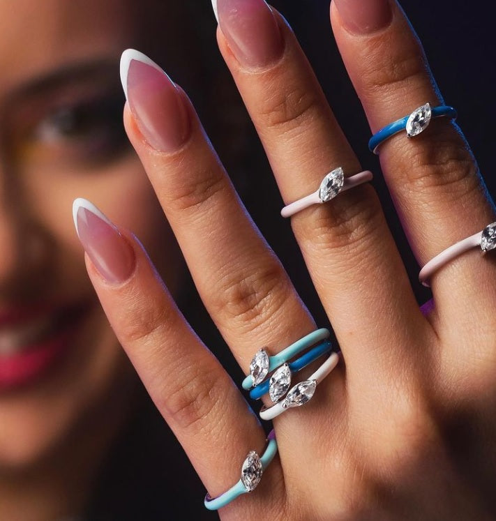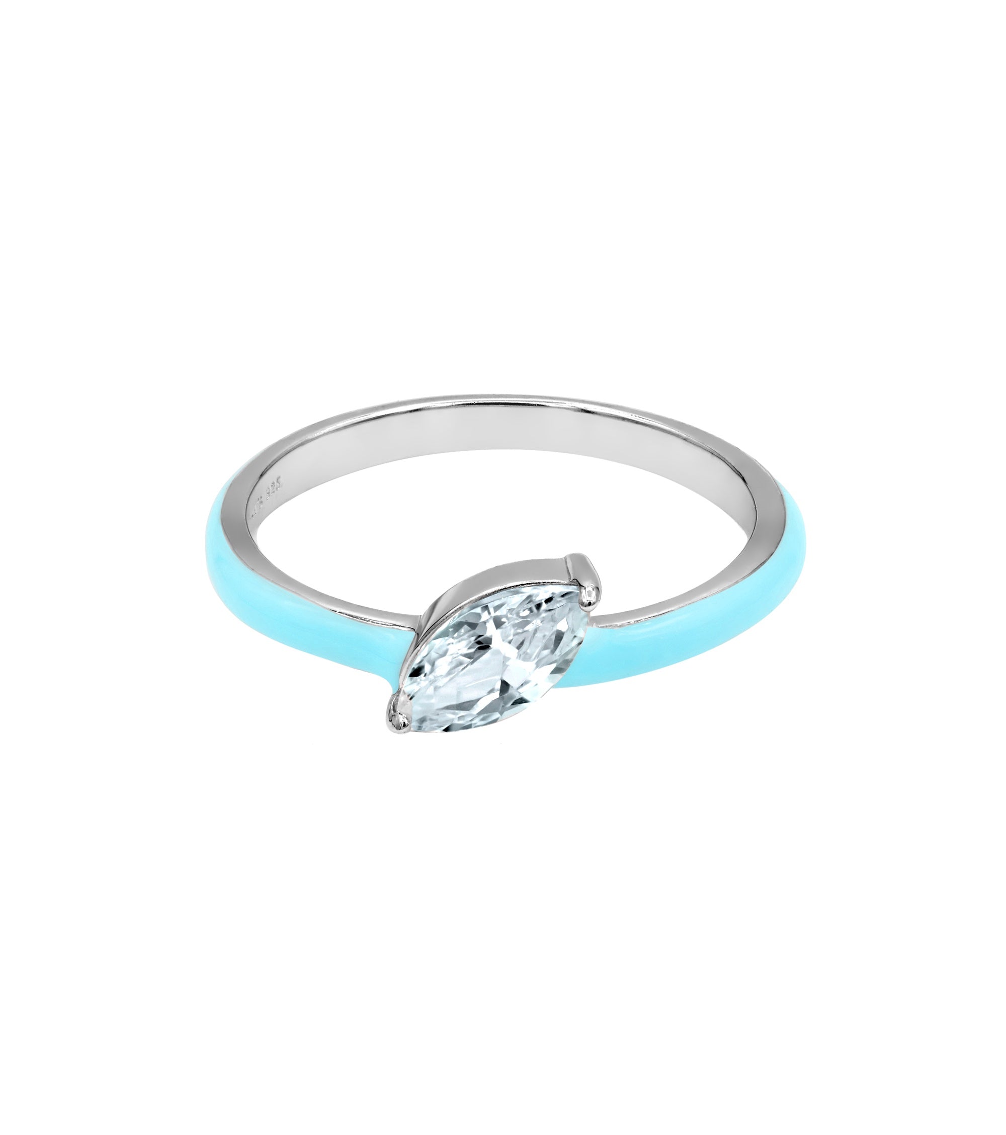 This enamel coated ring has a youthful yet elegant feel to it. The baby blue coloring is fun and contrasts beautifully from the diagonal facing marquise centerpiece. Stack with other colors of the same design to achieve a unique look.