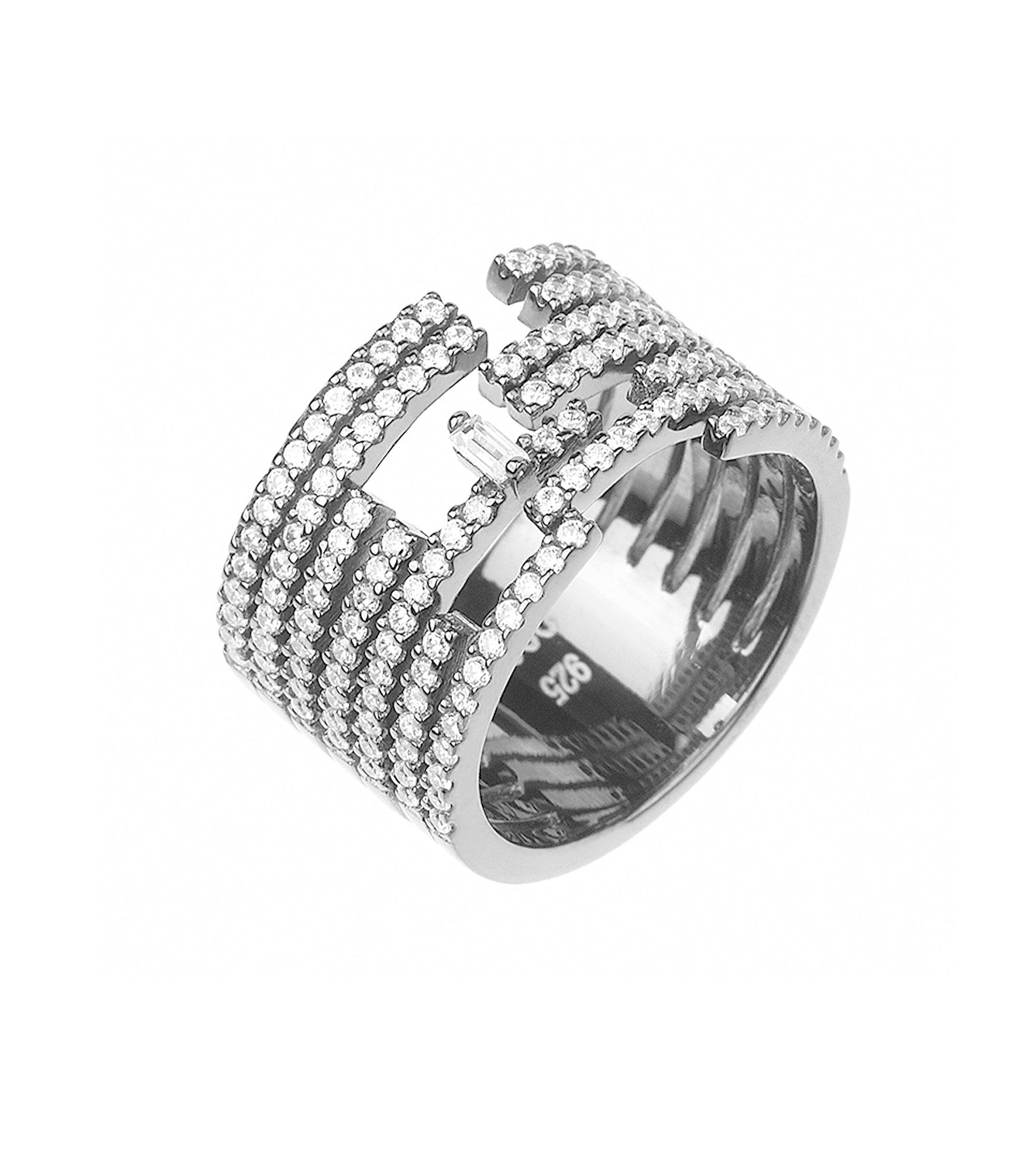 This 925k sterling silver ring has a very modern feel to it. The design is inspired by the rapid growth of technology. The edgy centerpiece resembles the inside of a computer chip. This ring is for the ladies that enjoy the "futuristic" look.