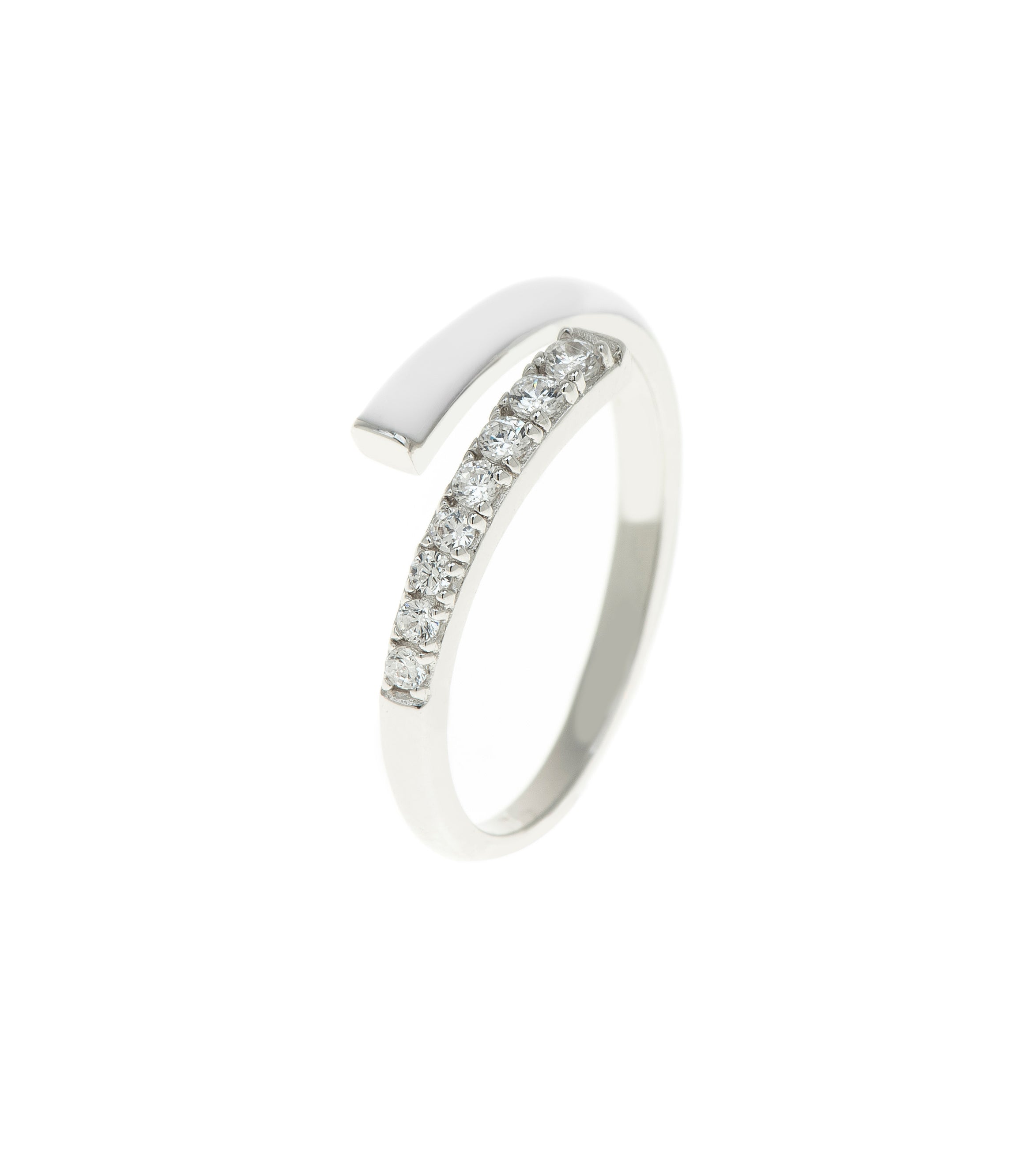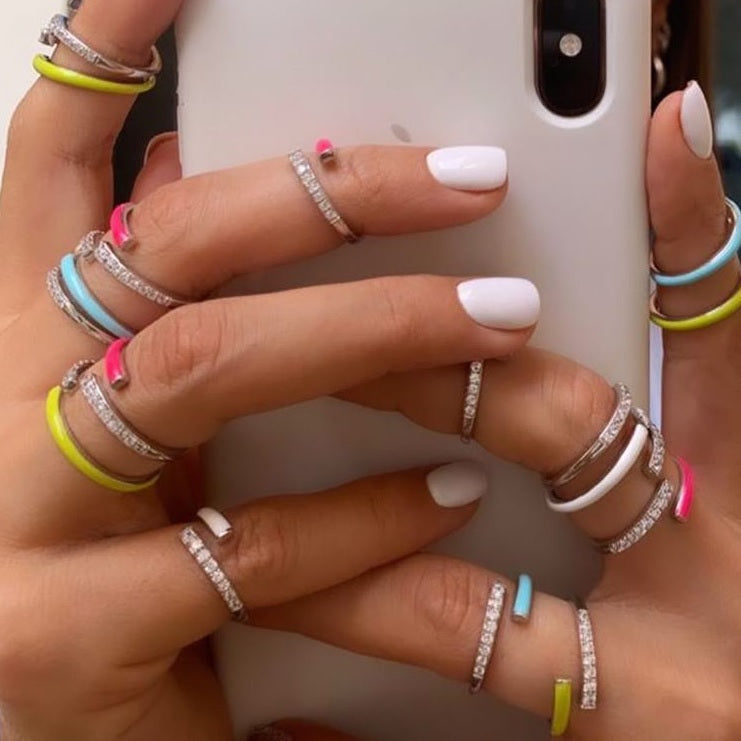 This piece is a fun and funky addition to your day look. It consists of an asymmetric band ring; half encrusted with stones and the other half a colorful enamel coating. It looks gorgeous when stacked with other colors of the same design.
