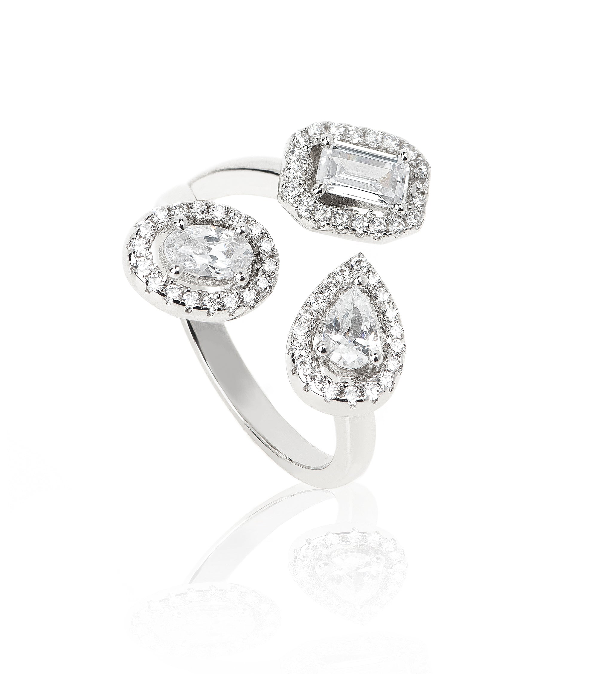 Are you looking for an eye-catching ring that will easily match your other pieces of jewelry? You've come to the right place. This ring comprises three different shaped stones that sit scattered beautifully along the finger.