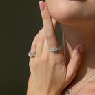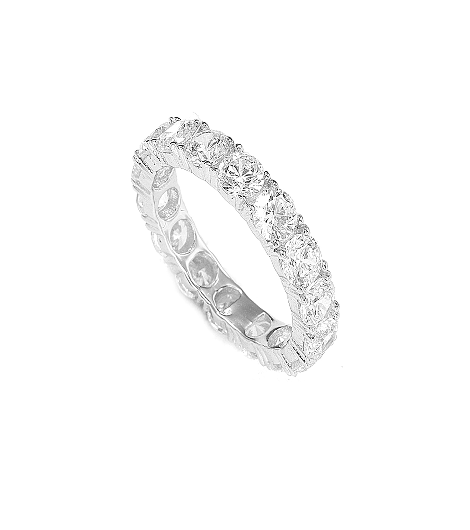 This classic piece comprises a band encrusted in a single row of 4mm stones. Stack this ring with a combination of other rings for a glamorous evening look.