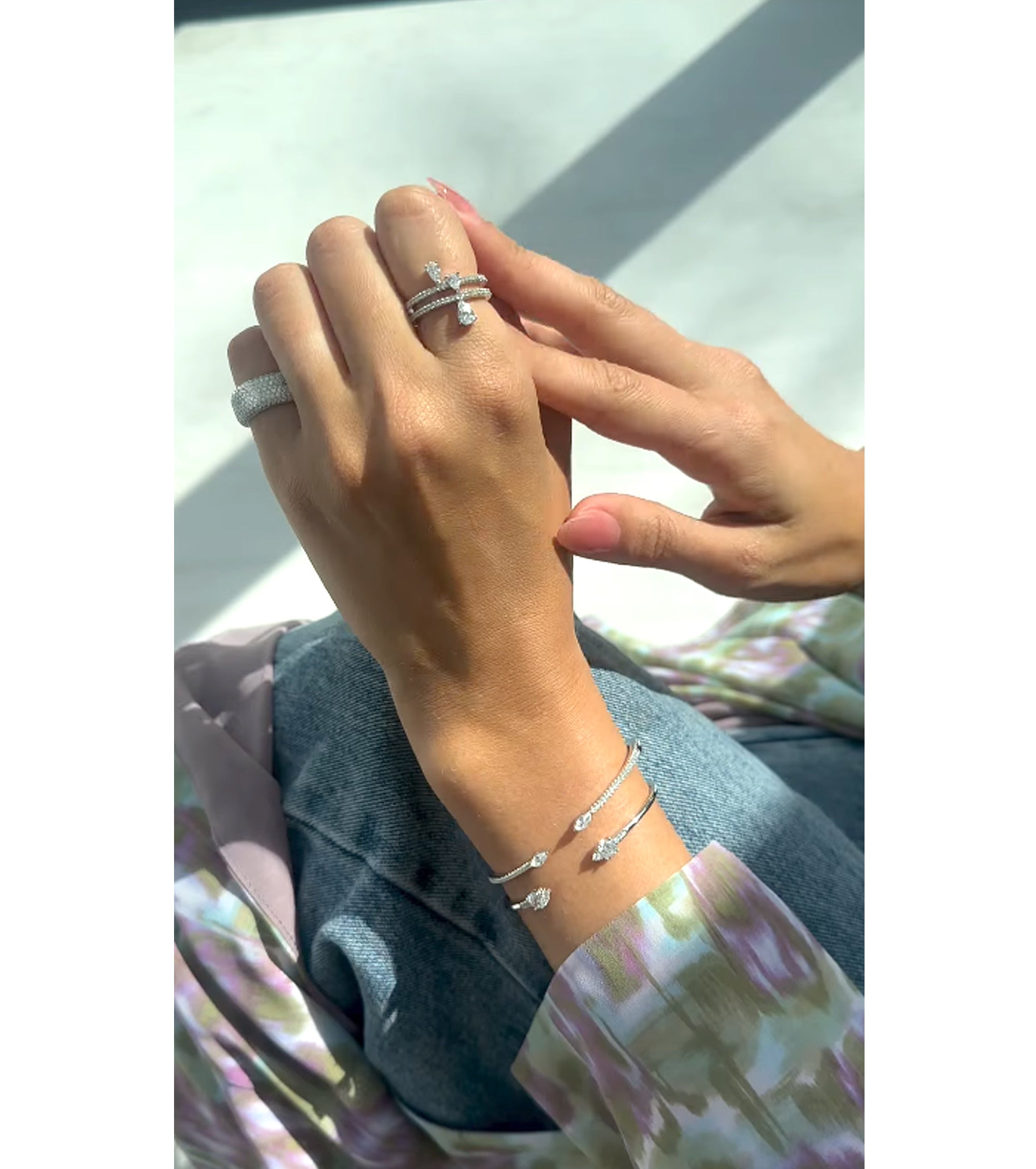 This ring comprises two bands of cubic zirconia with teardrop shaped stones sitting opposite each other. The asymmetrical property of this piece is what gives it an edge; it will not go unnoticed.