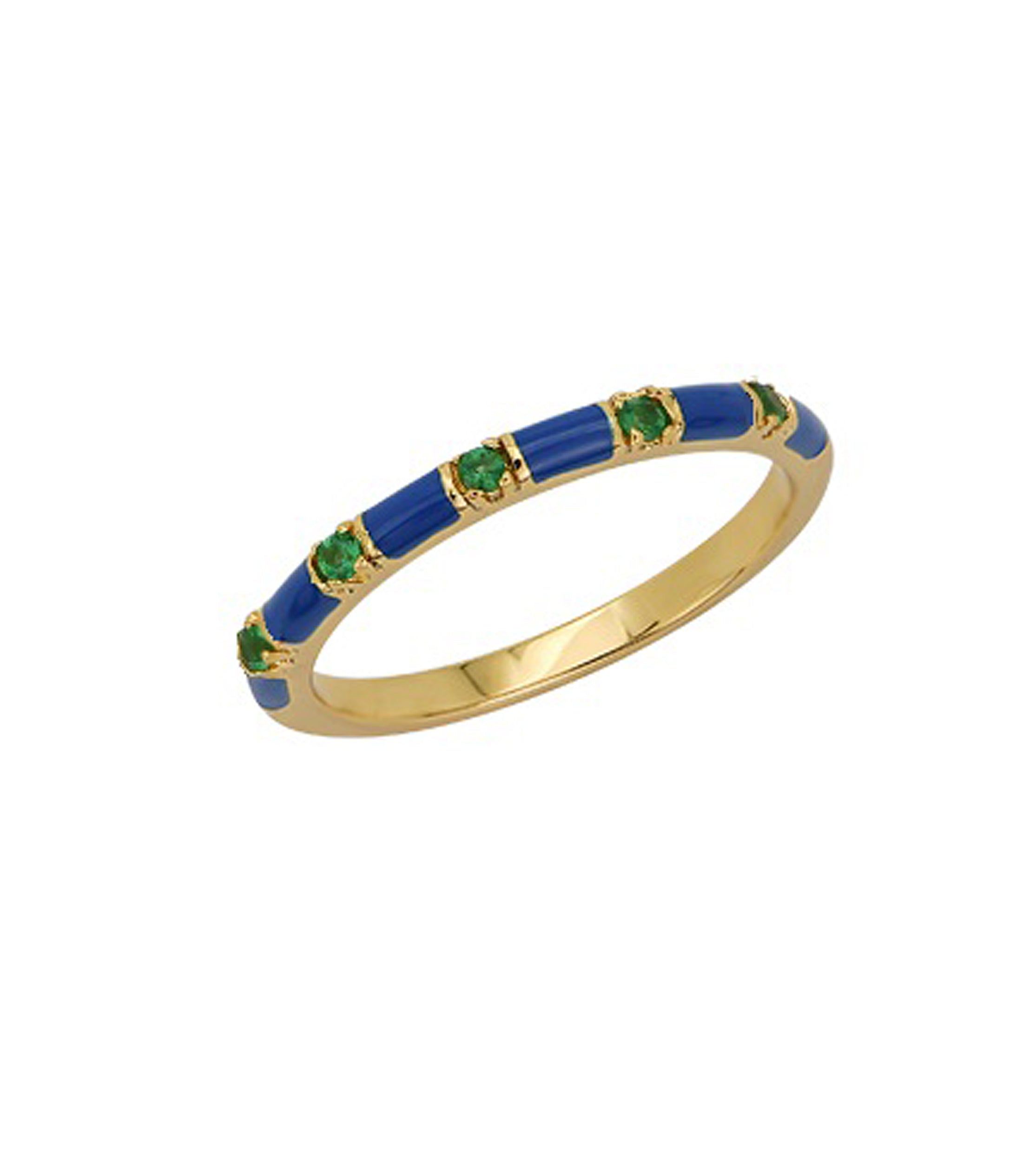 This is the perfect filler ring for those of you looking to add some color to your fingers! Fun but elegant, this piece has nautical blue enamel bars in between forest green stones to create a color block effect that is eye-catching.